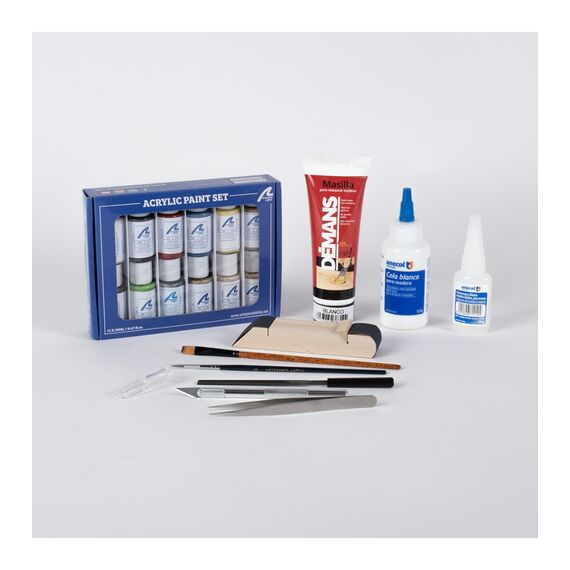 - Wesentliche Hobby-Werkzeuge (Artikel 27003N): Ein Set mit 2 Acrylpinseln, einem Schleifblock, einem Cutter Nr. 1 und einer geraden Pinzette für die präzise Montage und Endbearbeitung.