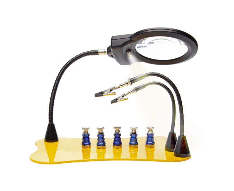 Sowohl die Arme als auch die Arbeitshalterungen können abgenommen und neu positioniert werden, um jeder Aufgabe gerecht zu werden. Stabile und dennoch flexible Arme mit starken Magneten, die sie sicher in Position halten, und Gummiabdeckungen an den Krokodilklemmen zum Schutz empfindlicher Teile.